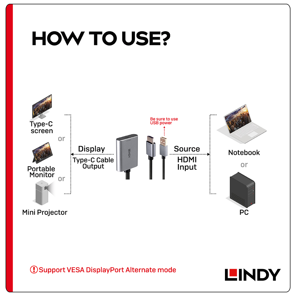 • 可輕鬆將HDMI影音訊號轉換成Type C影音訊號